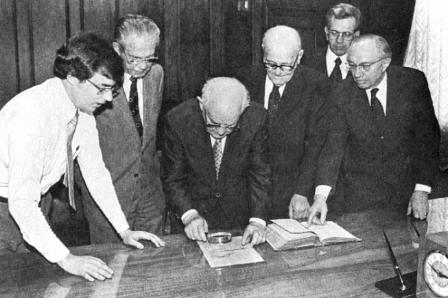 From left to right: Mark Hoffman, First Counselor to the First Presidency, N. Eldon Tanner, Prophet and President Spencer W. Kimball, Second Counselor to the First Presidency, Marion G. Romney, Apostle Boyd K. Packer, and Apostle Gordon B. Hinkley (sic)